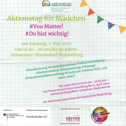 Aktionstag für Mädchen* im Hohenlohekreis. Am Samstag, den 7. Mai 2022 findet vom 10 - 16 Uhr ein Mädchen*aktionstag im Albert-Schweitzer-Kinderdorf in Waldenburg statt. Es gibt verschiedene Workshops, Burger zum Mittagessen und Zeit zum Zusammenkommen.